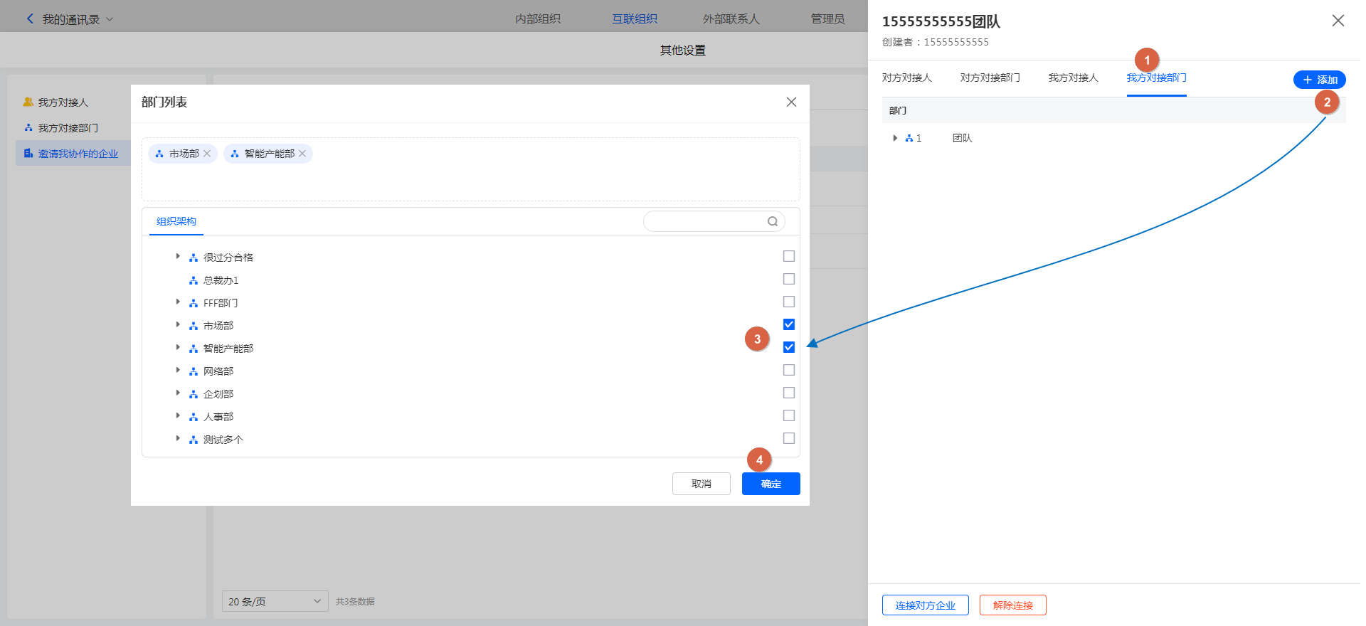 互联组织中找到「邀请我协作的企业」,找到对方企业点击进行详情页,在「我方对接部门」列表处可以添加企业内部部门,作为我方对接部门参与对方企业业务协作。如下图所示: