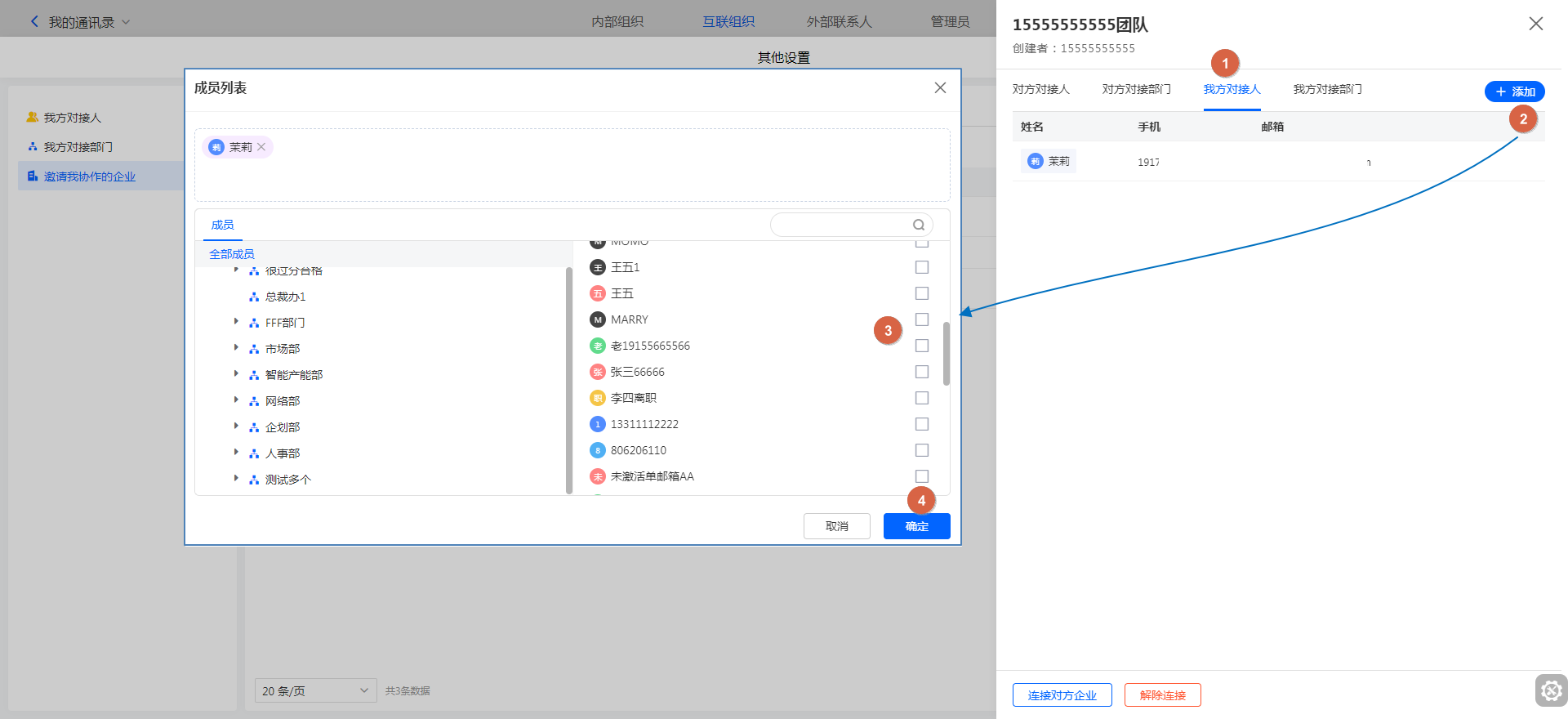互联组织中找到「邀请我协作的企业」,找到对方企业点击进行详情页,在「我方对接人」列表处可以添加企业内部成员,作为我方对接人参与对方企业业务协作。如下图所示: