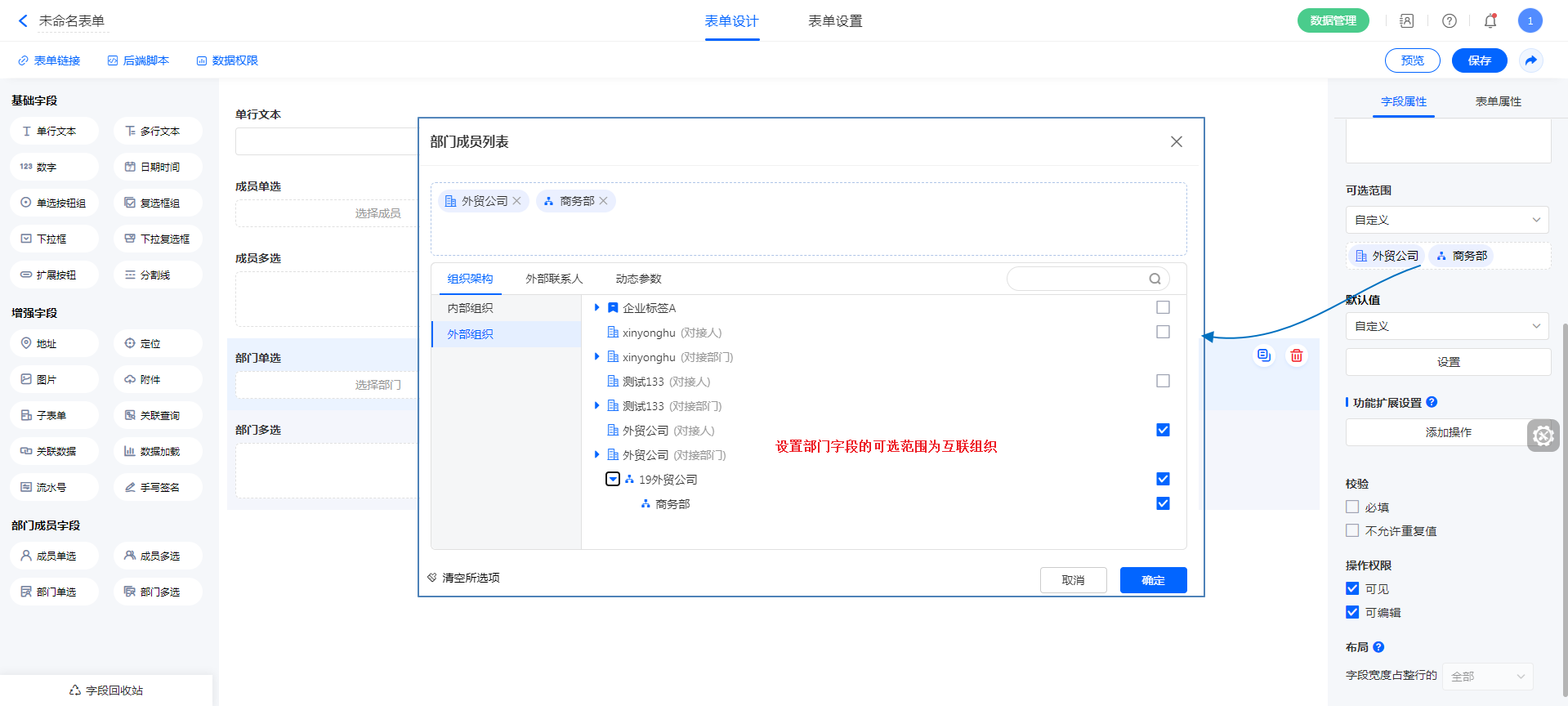 在部门字段设置时,可以设置「可选范围」和「默认值」为互联组织。如下图为可选范围的设置: