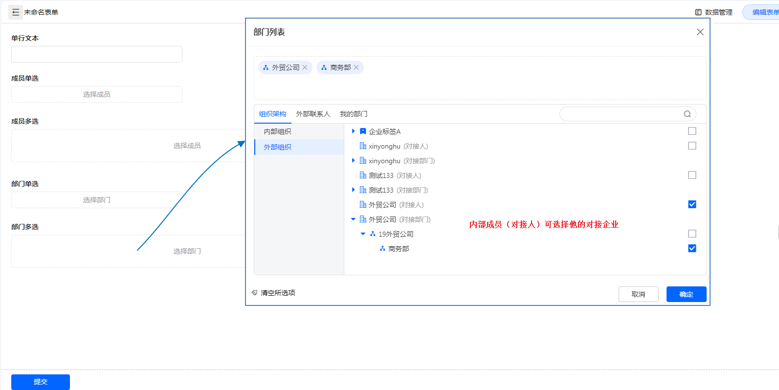 但表单中设计了成员或部门字段时,那么在设计或者使用表单时,可以选择互联组织或成员。