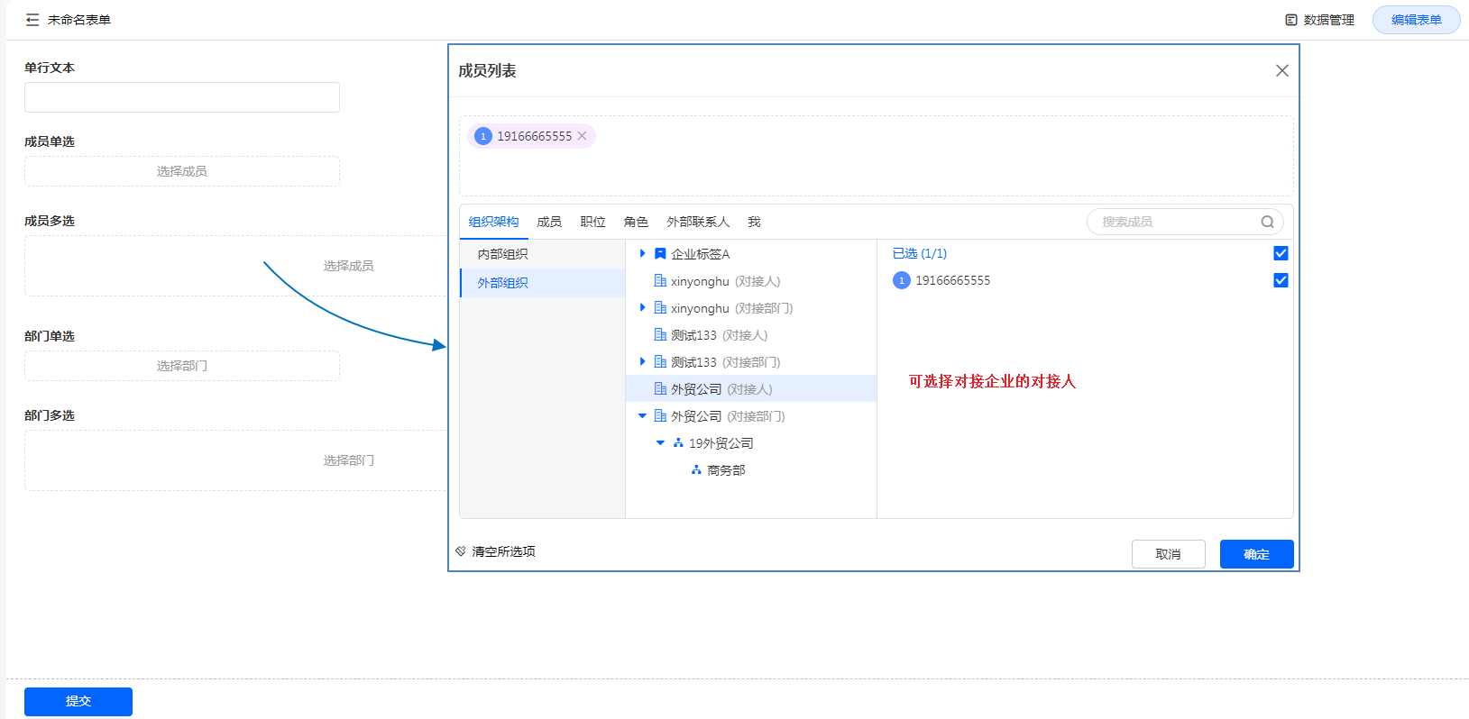内部组织和外部联系人的成员,如果有对接的企业,可以选择对接企业的组织和成员。