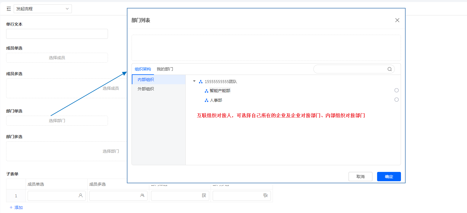 互联组织的对接人在有 权限 的情况下,进入到主企业发布的表单中选择部门时,只能选择自己所在的企业及企业对接部门、内部组织的对接部门。