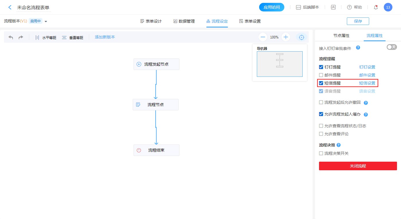 【流程设计】-【流程设定】-【流程属性】-【流程提醒】-【短信提醒,短信设置】