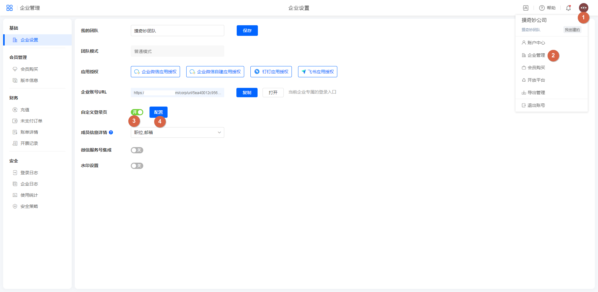 创建者点击右上角头像,在「企业管理 >> 企业设置」中开启「自定义登录页」。