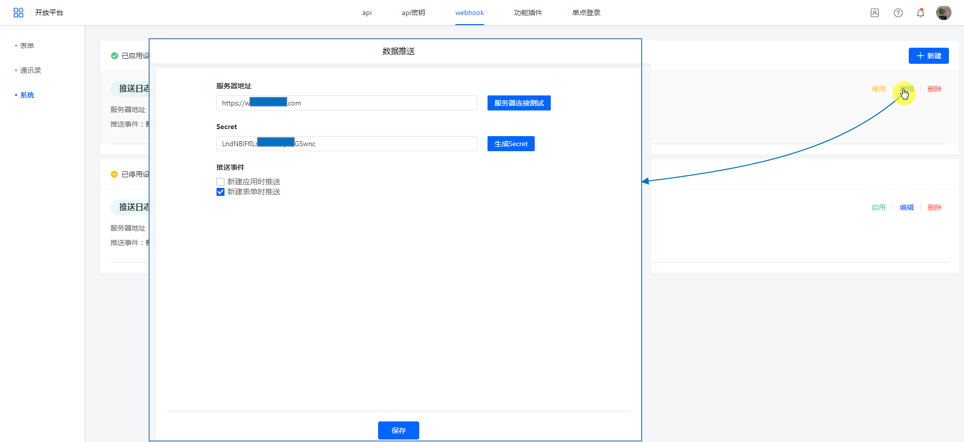 编辑已存在数据推送,【服务器地址】、【Secret】、【推送事件】可编辑。
