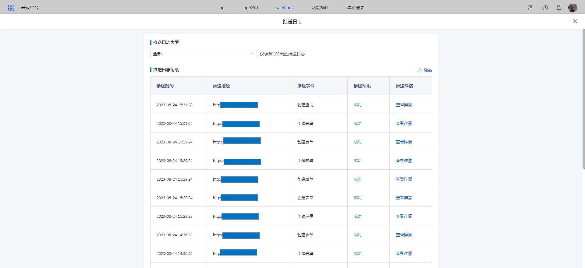 推送日志里记录了每条推送记录的时间、地址、事件、结果、推送详情。