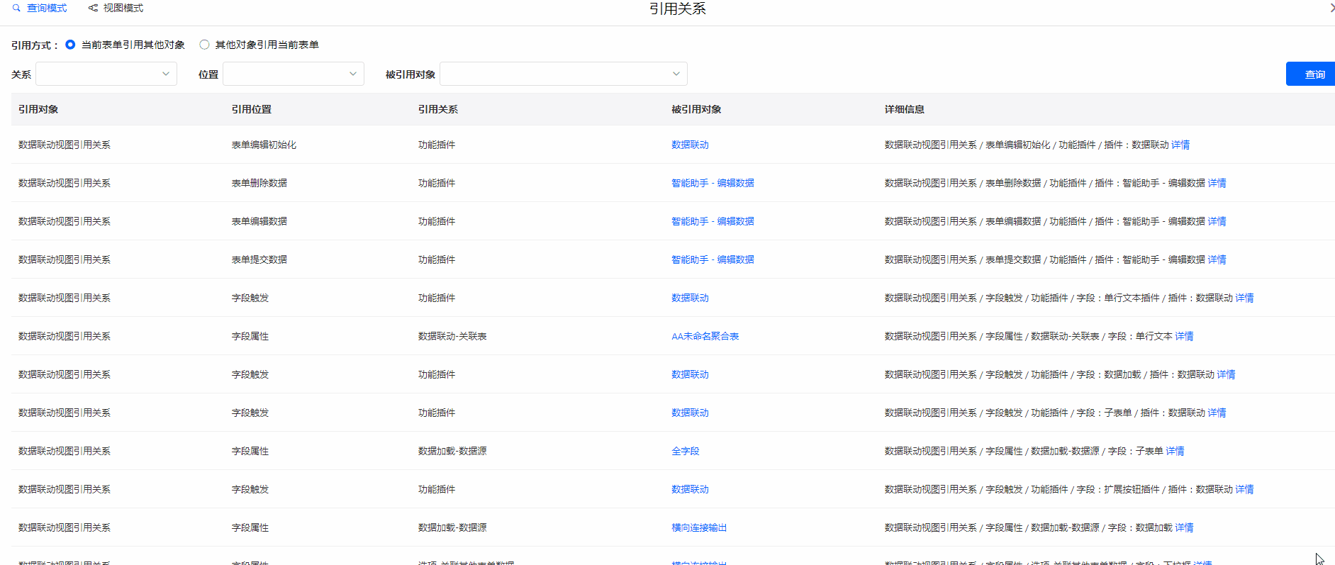 • 其他对象引用当前表单:当前表单被其他表单、聚合表、数据视图、报表等引用。