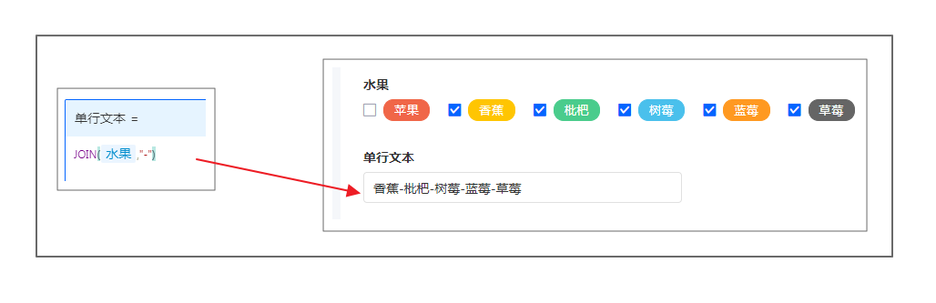 如需将水果中勾选的选项通过”-“组合在一起,则可设置公式为JOIN(水果,"-")。