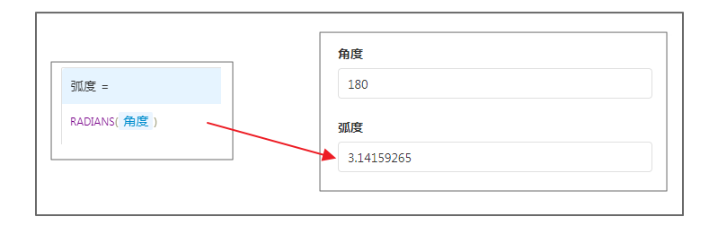 如计算 180° 对应的弧度,可设置公式为RADIANS(180),返回 3.14159265
