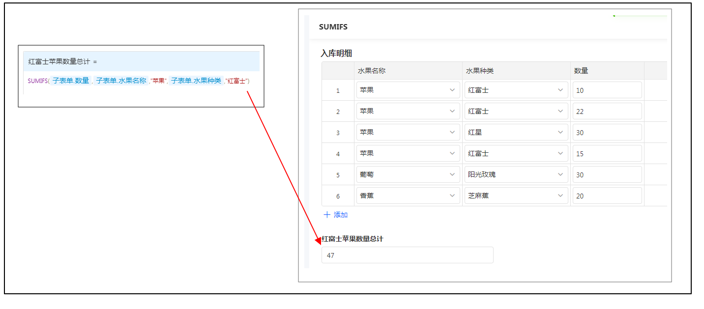 如,计算入库明细中水果名称为「苹果」,且种类为「红富士」的全部入库数量,则可以在「红富士苹果数量总计」字段设置公式为: