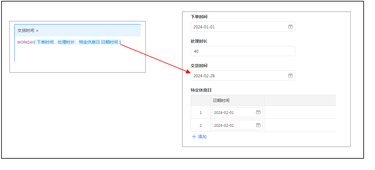如,计算交货时间时,子表单日期记录特定休息日,则设置公式为 WORKDAY(下单时间,处理时长,特定休息日.日期时间),扣除周末和假期,即可根据下单时间计算出对应的交货时间。