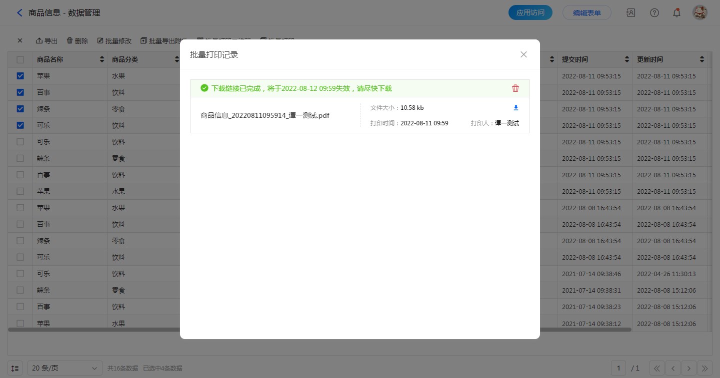 当设置成员的批量打印权限后,成员在访问表单的时候即可对数据进行批量打印。