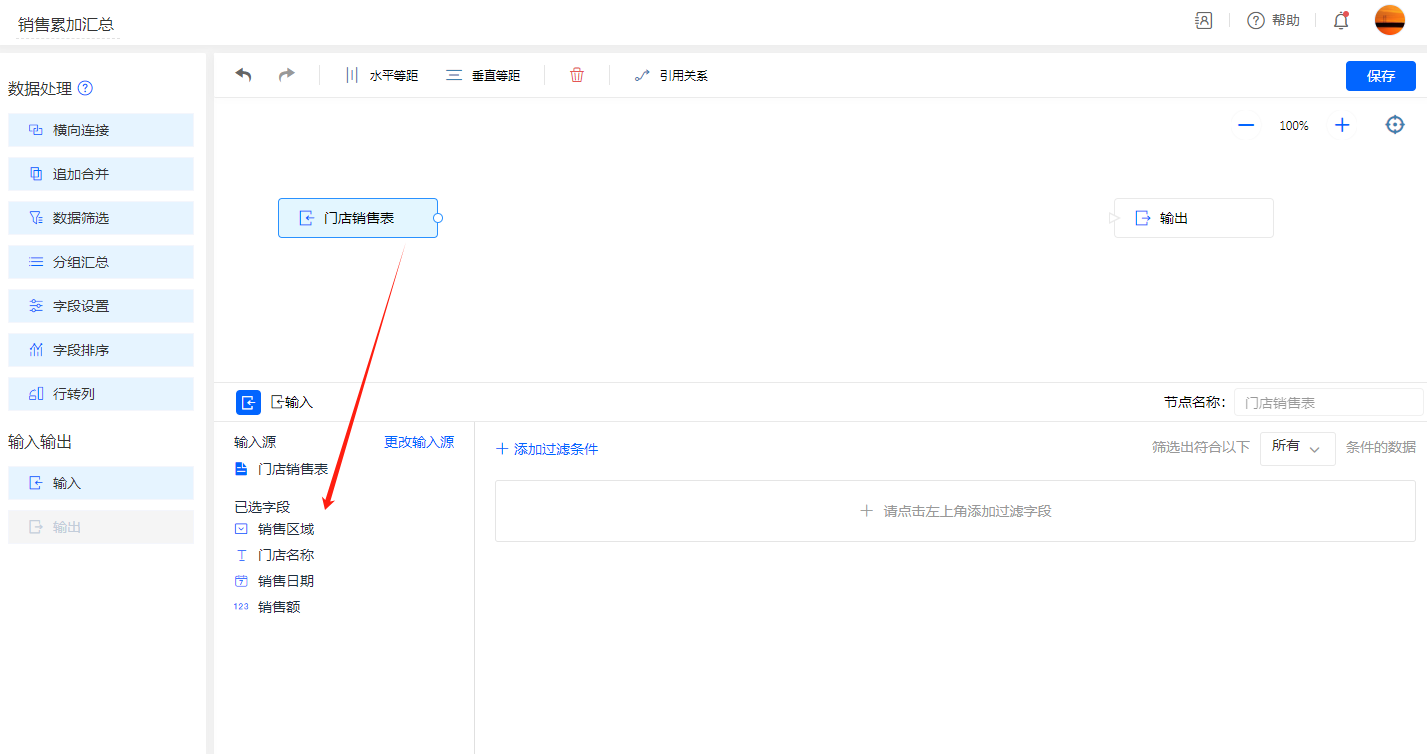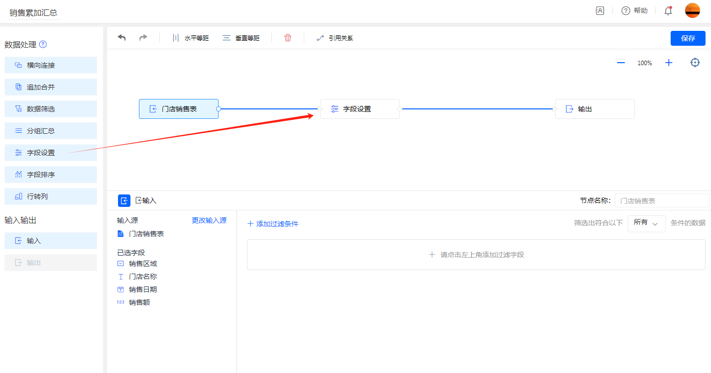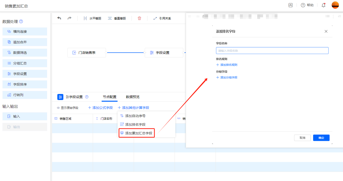 为数据流添加一个字段设置节点用于累加汇总计算: