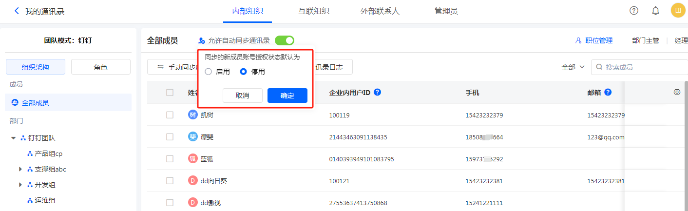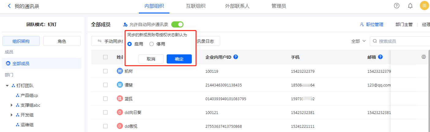1)首次同步通讯录时,在职成员的授权状态都默认为「已启用」,可手动修改授权状态。