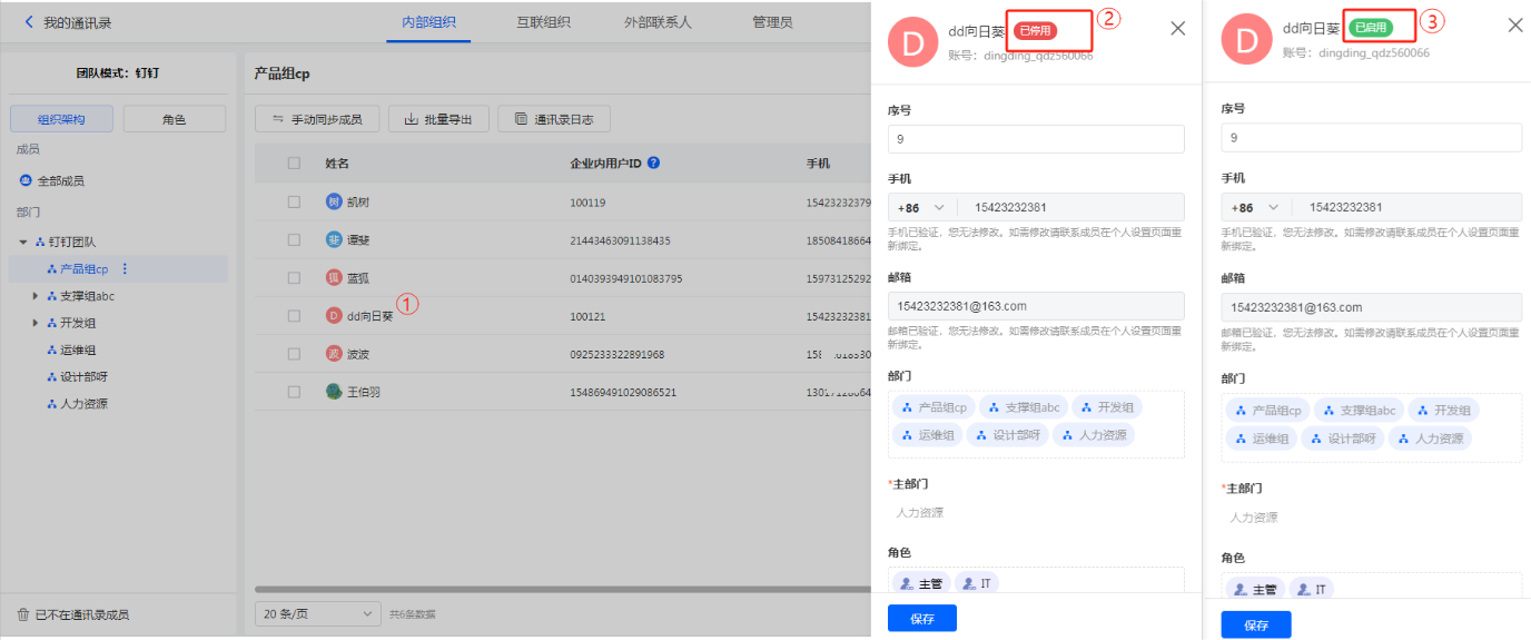 点击成员详情即可看到成员是停用还是启用状态。