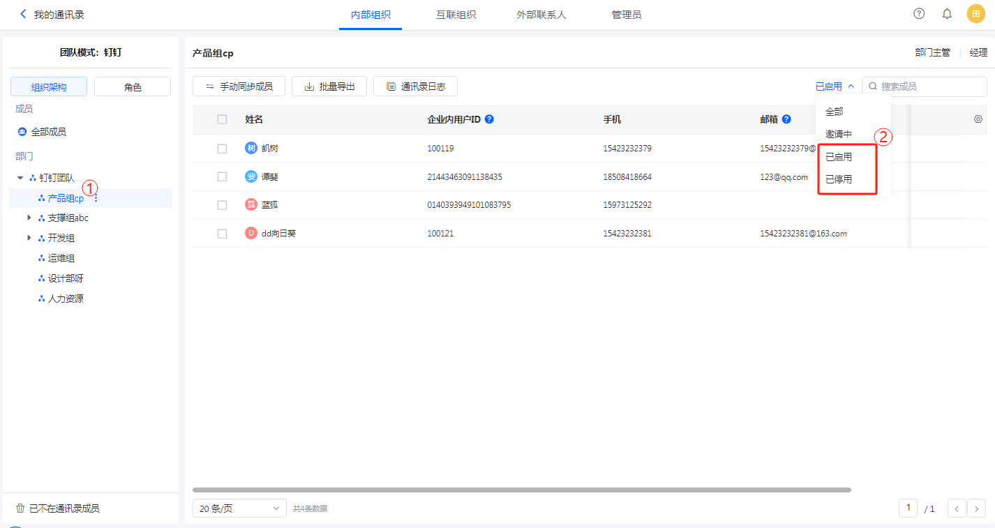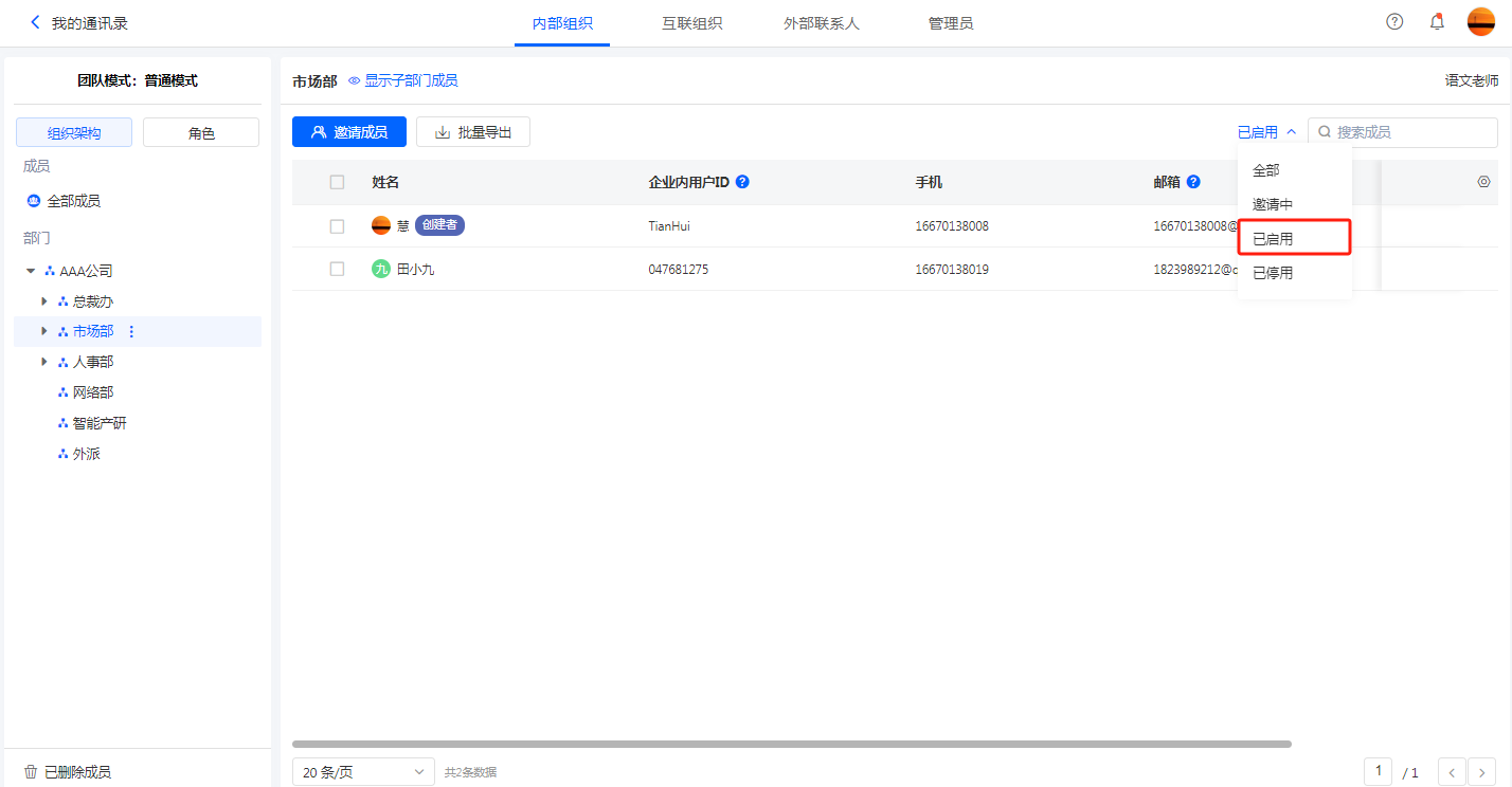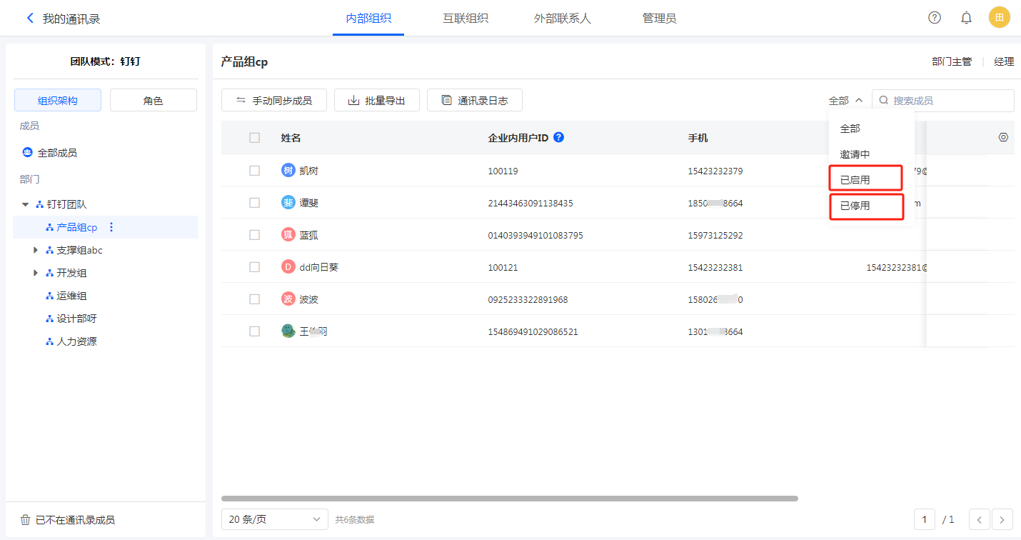 所有模式的企业均可通过下图所示的方式筛选出已停用或已启用的成员: