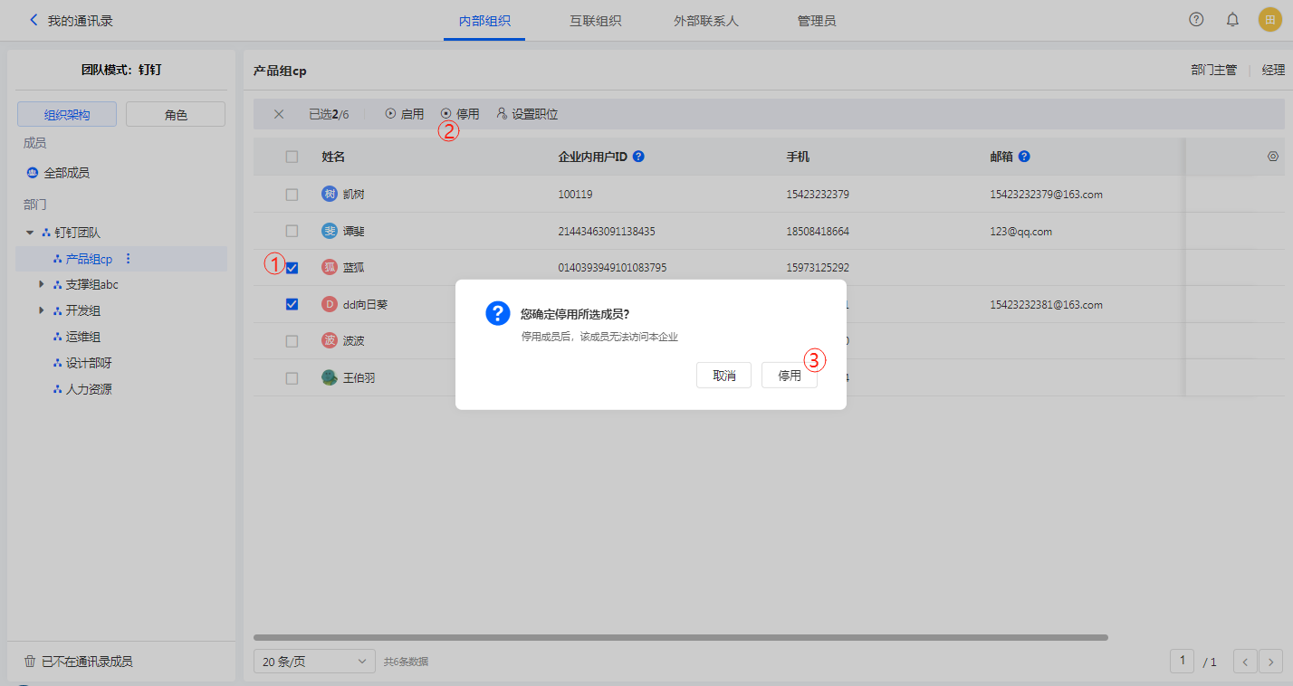 4)管理员(创建者、系统管理员、有通讯录可见可管理权限的普通管理员)无法将自己停用。普通管理员和普通成员可被他人停用。