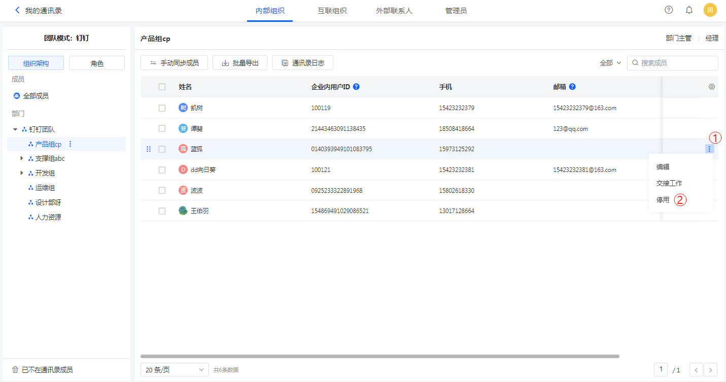 也可以直接选中需要停用的成员,在右侧操作按钮中点击「停用/启用」,如下图所示: