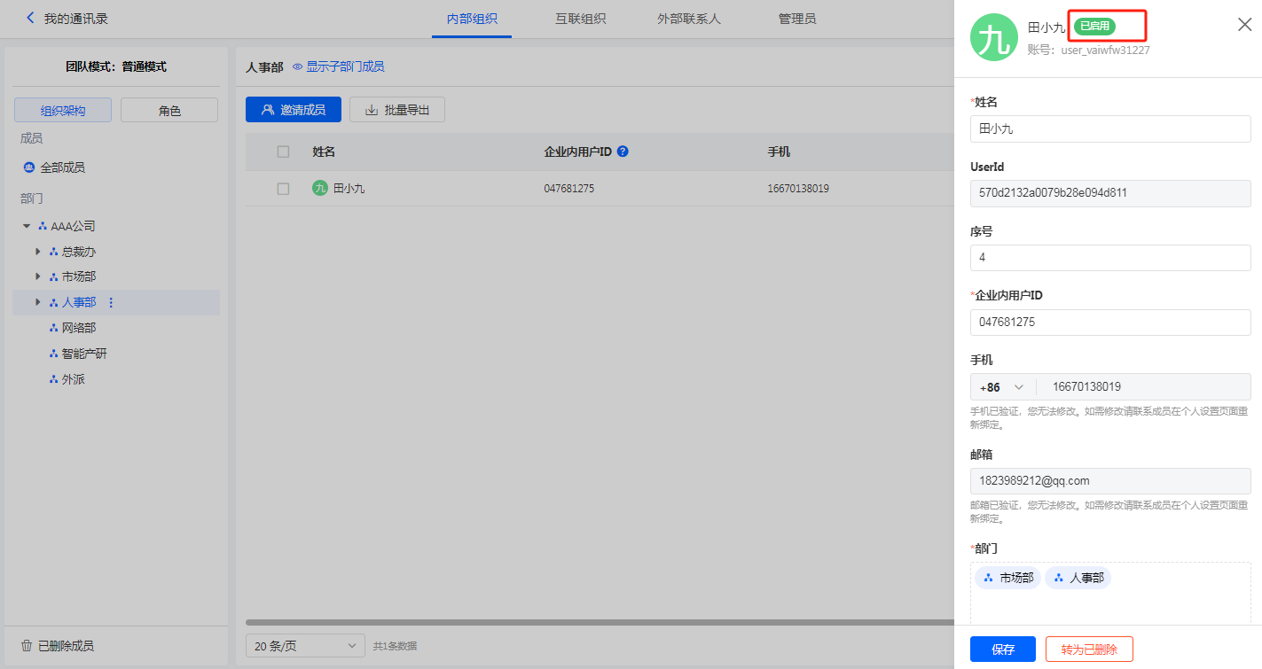 启用后,成员可以正常访问企业。点击成员详情可以看到状态为已启用: