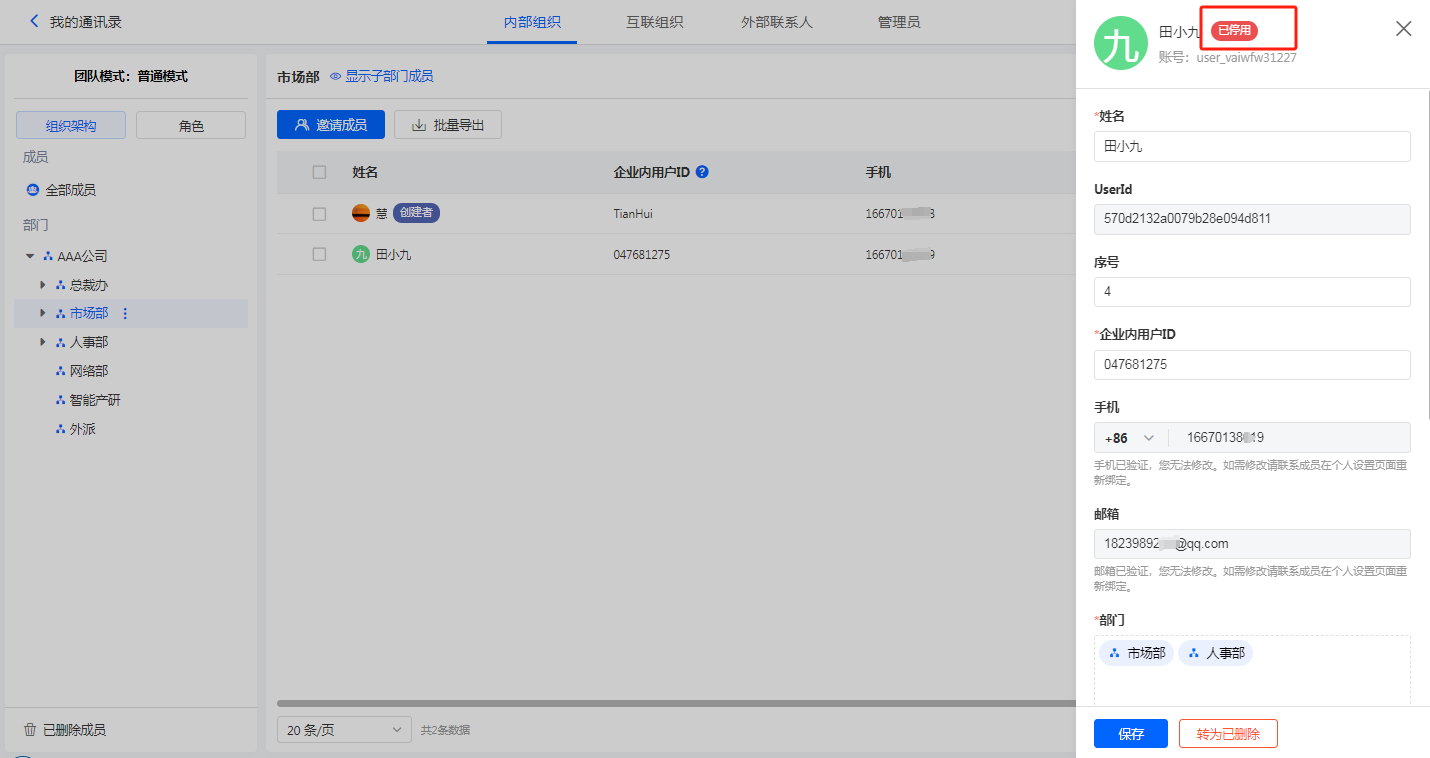 5)停用后的在职成员,可被转为已删除,转为删除后显示在已删除成员页面。