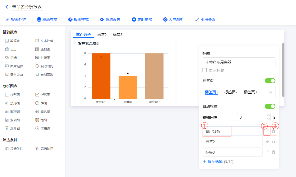 可直接拖动左侧[基础报表]、[分析图表]中的组件进布局容器内。如果有多个标签,将拖入选中的标签页中。