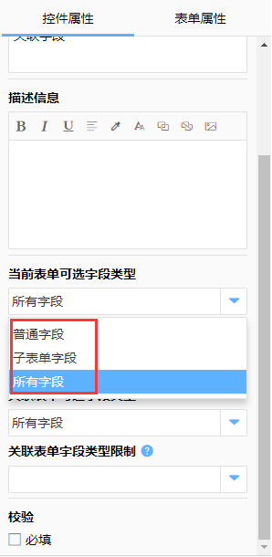 可选字段类型是限制当前表单的字段类型,可选字段类型目前支持:普通字段、子表单字段以及所有字段(子表单字段和普通字段)。