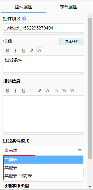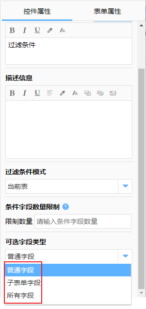 对过滤字段可以关联的其他字段进行限制,避免选择不被支持的字段(默认为同类型的字段,可以选择包含多个类型)。