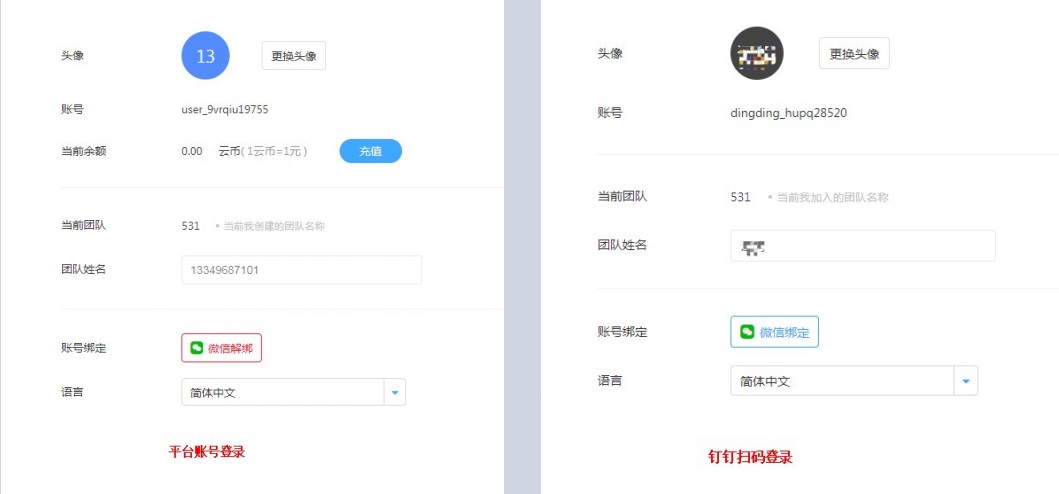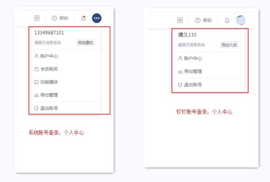 速搭账号和钉钉扫码登录系统,在个人中心的功能不一致。