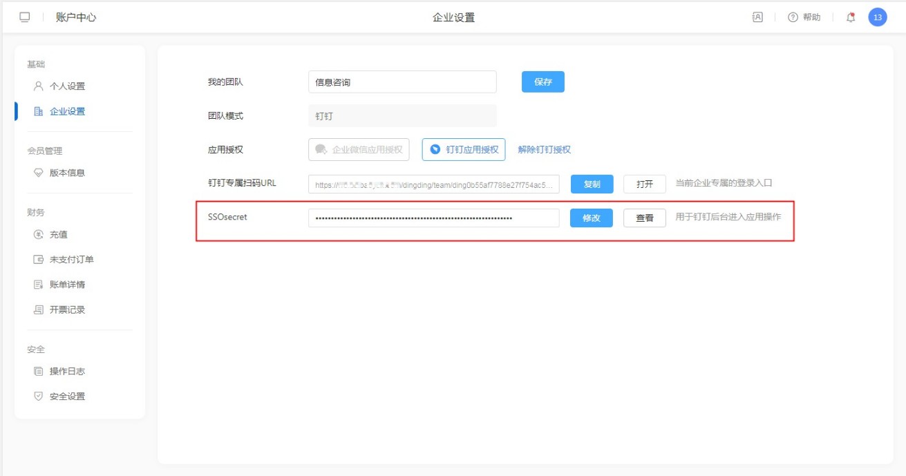 SSOsecret:为钉钉团队的属性,在钉钉开放平台,企业和ISV在开发应用的管理后台时,使用SSOSecret即可完成管理员登录身份认证。