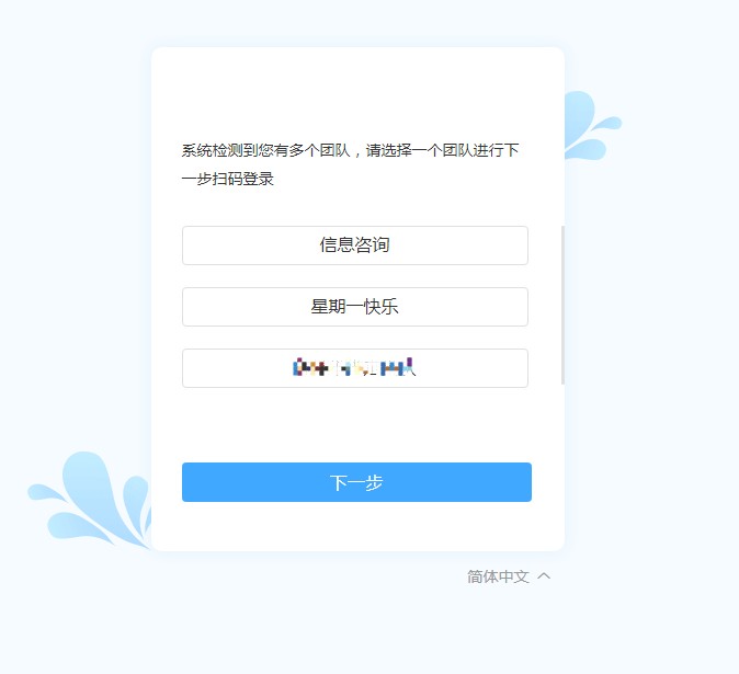 如果该钉钉用户在多个团队内,那么扫码后会出现团队选择的页面,选择对应的团队即可登录。