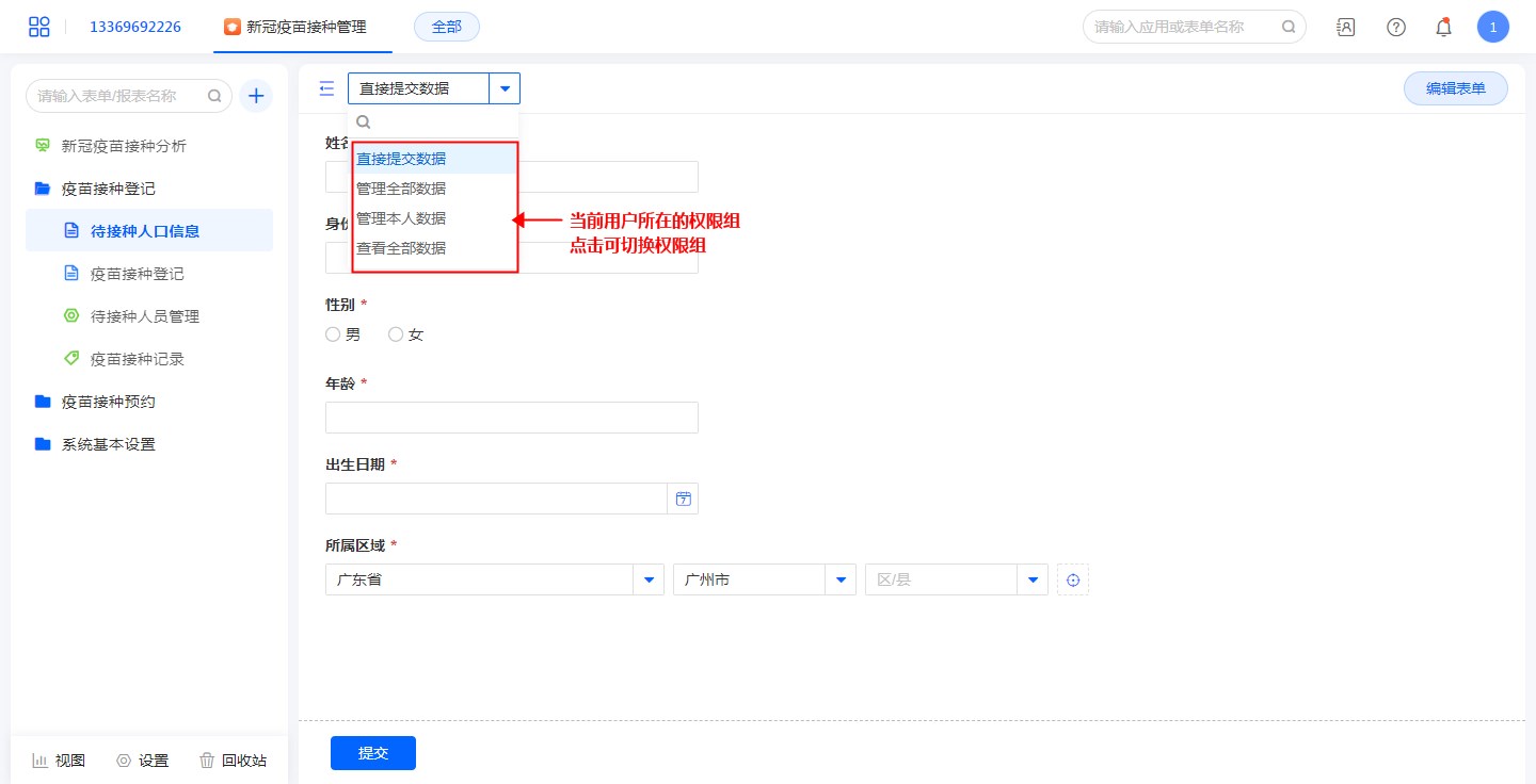 如对同一用户配置了多个权限组,则此用户可在表单访问页面进行权限切换。