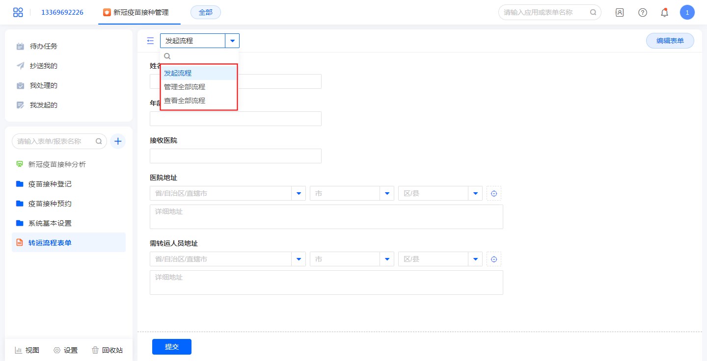 管理全部流程的显示效果和管理全部数据类似,可以显示出所有人提交的流程数据,但是和在数据管理页面提交数据不同的是:在当前模式下新建的数据,会正常执行流程。