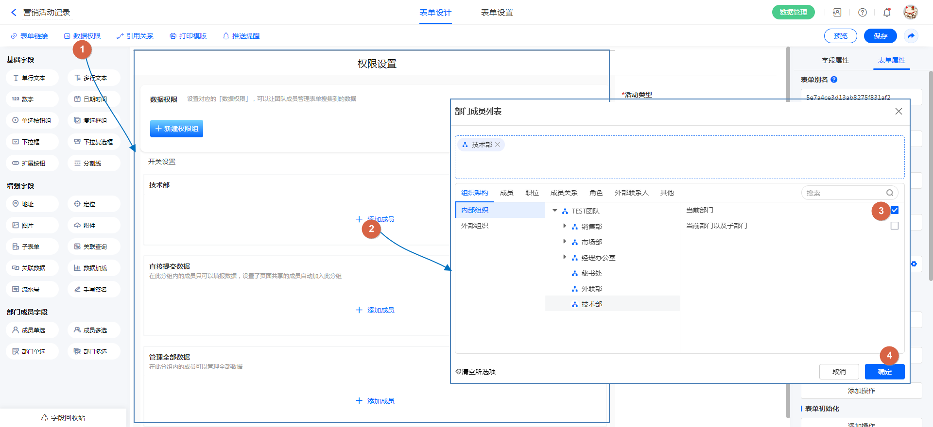 当表单为普通表单时,有4种默认权限:直接提交数据、管理全部数据、管理本人数据、查看全部数据。