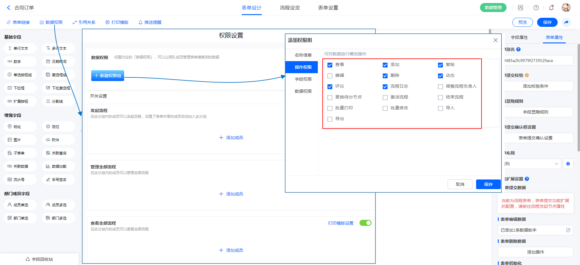 如对系统内置的权限组不满意,可自行添加自定义权限组,自定义权限组可完全自定义,无论是普通表单还是流程表单,都可以根据需求自行添加需要的流程权限【如下图所示】;