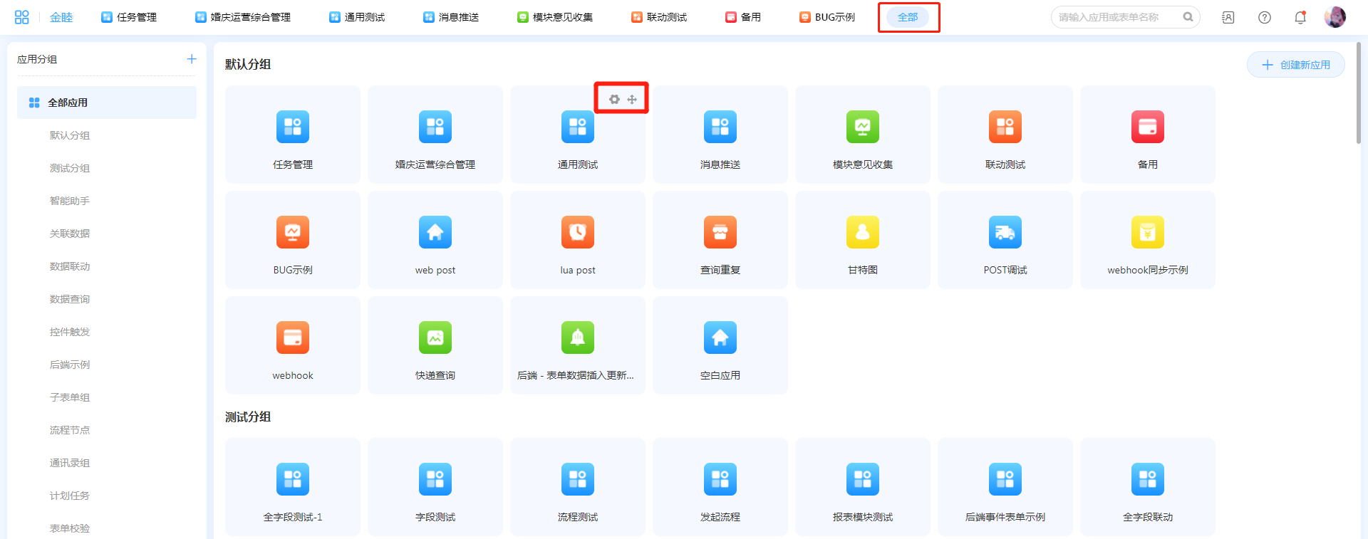 应用管理包括应用的基本设置,如:应用分享安装、应用数据删除、应用排序与新建等。
