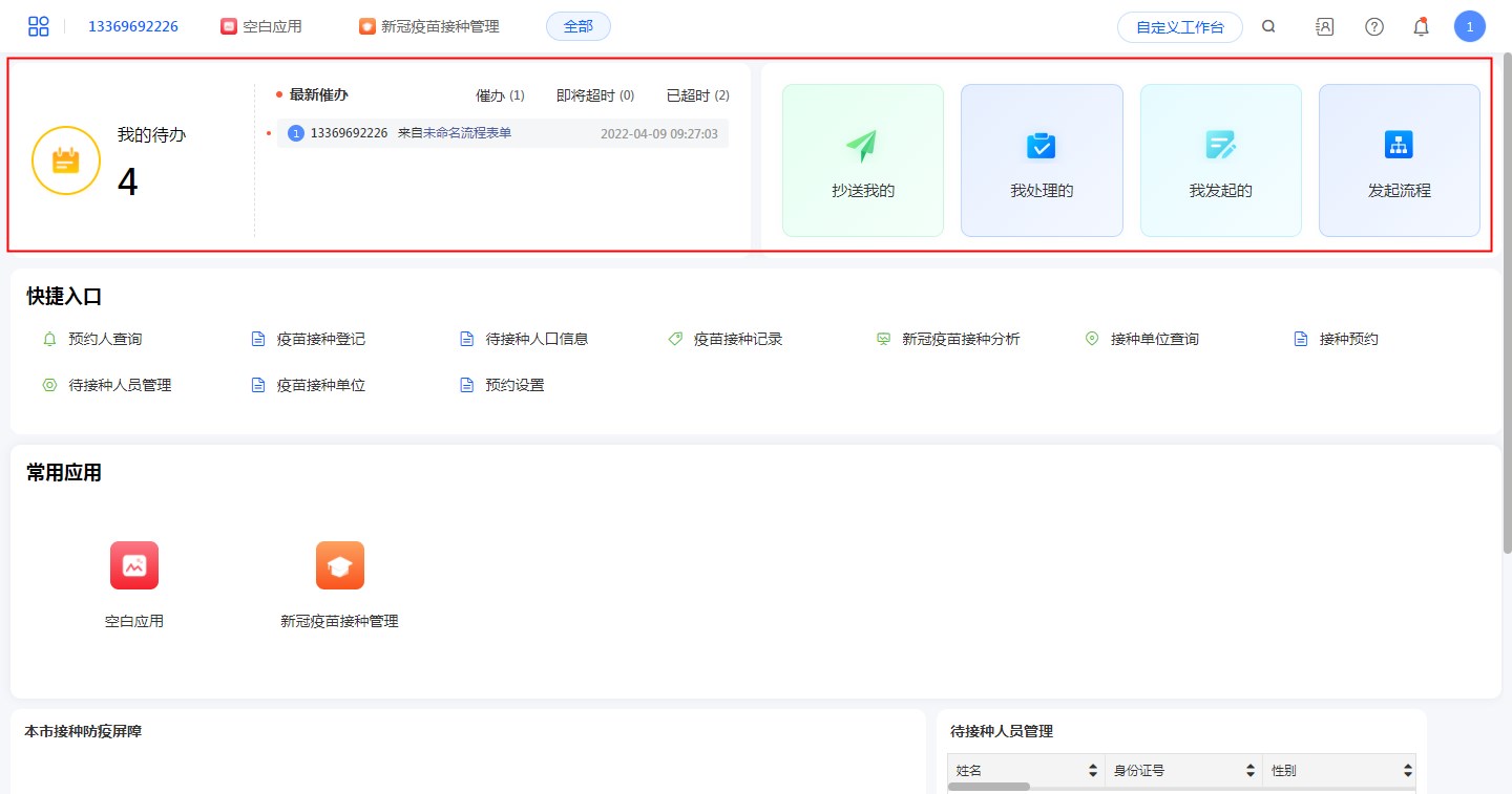 在工作台可以查看所有待处理的流程任务、个人发起的任务以及抄送给个人的相关任务,在这里可以对流程任务进行跟踪处理或督促任务的实行。