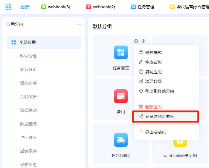 操作步骤:【工作台】——【鼠标悬浮在目标应用上,点击[设置]按钮】——【点击[分享给他人安装]】