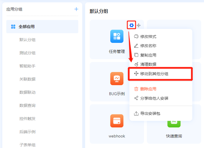 管理员可将应用进行分组管理,将应用移到需要的分组内。