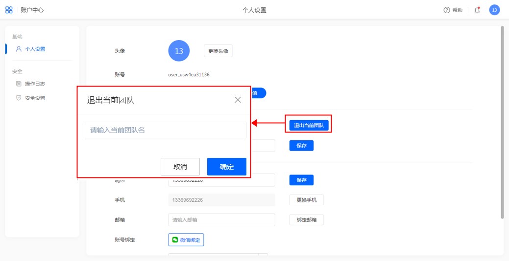 用户切换到非自己创建的团队后,在账户中心-个人设置中,可以主动退出团队。