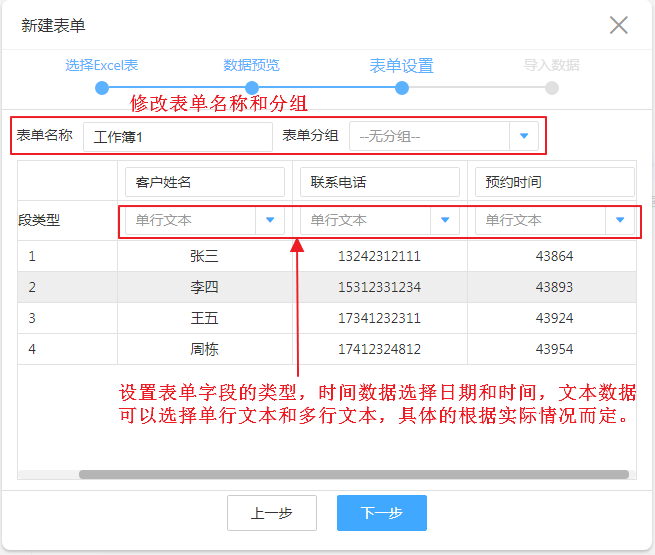 选择并导入Excel后,会对导入的Excel文件进行一次预览,并显示字段对应的关系,在导入前,应确认字段数量是否正确,并对表单名称、分组、控件字段类型等信息进行修改。