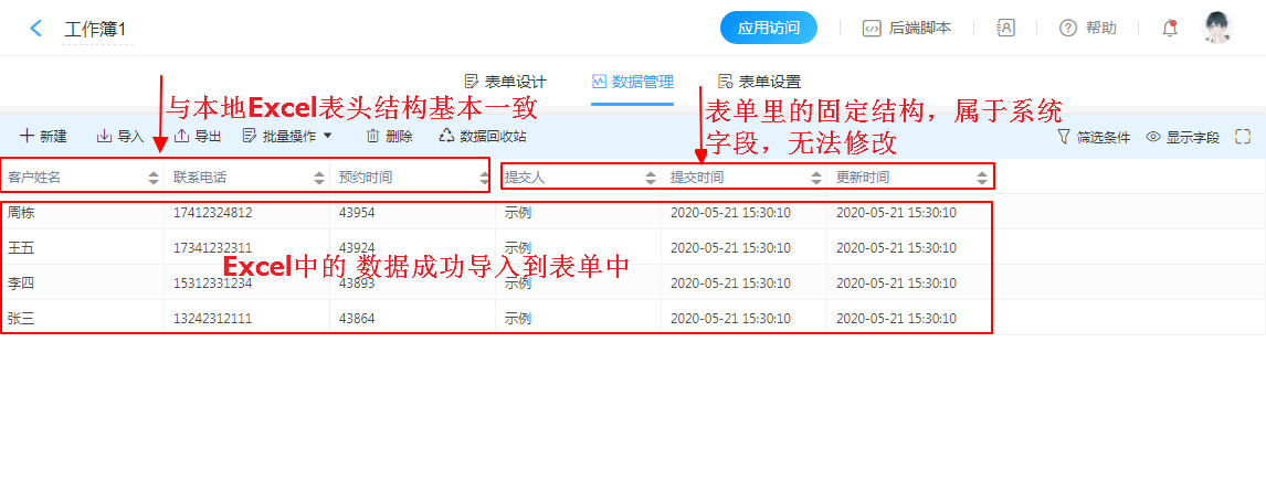 这里需要注意的是,如果导入的是通过其他表单导出的数据时,应注意避免重复导入`提交人、提交时间以及更新时间字段,系统字段无需也无法导入。