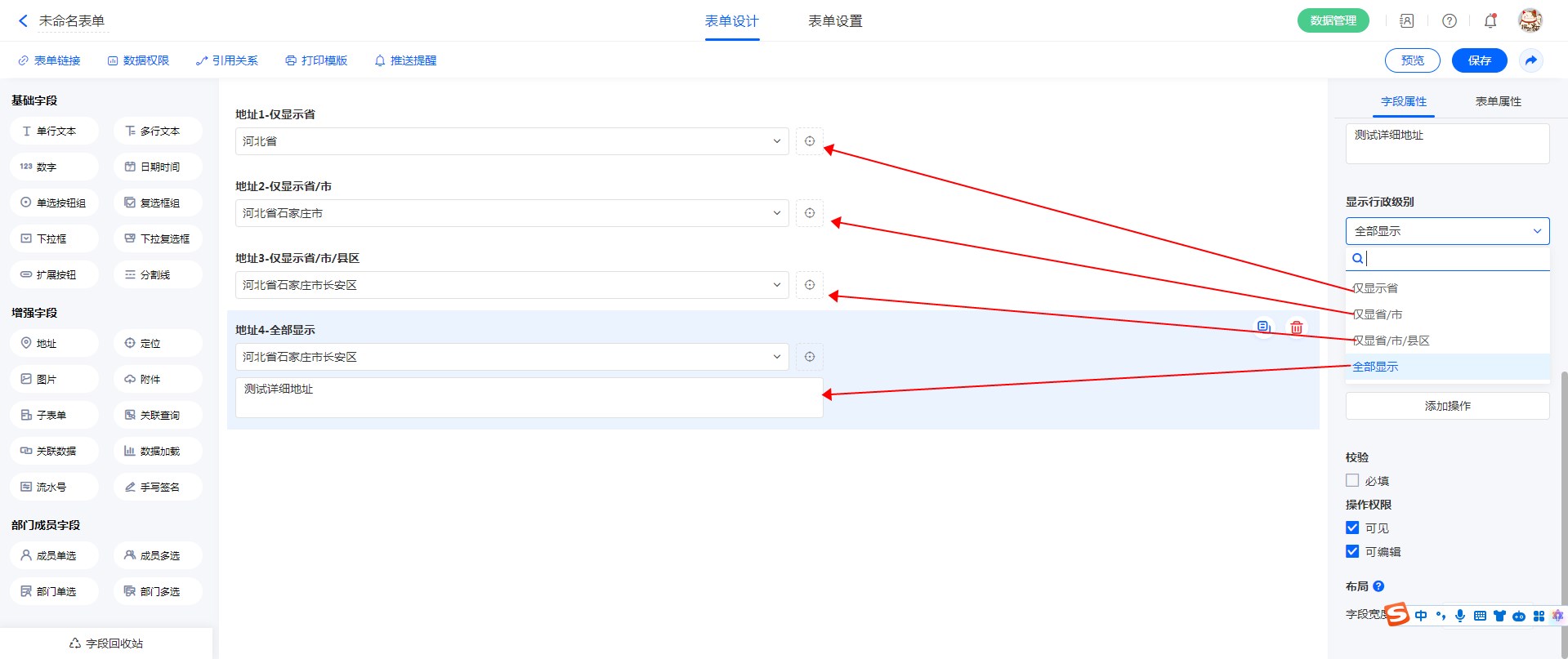 “地址”字段专门用来填写地址格式信息,其中“省、市、区”可以直接选择,无需手动填写,能够有效提高地址信息录入效率。
