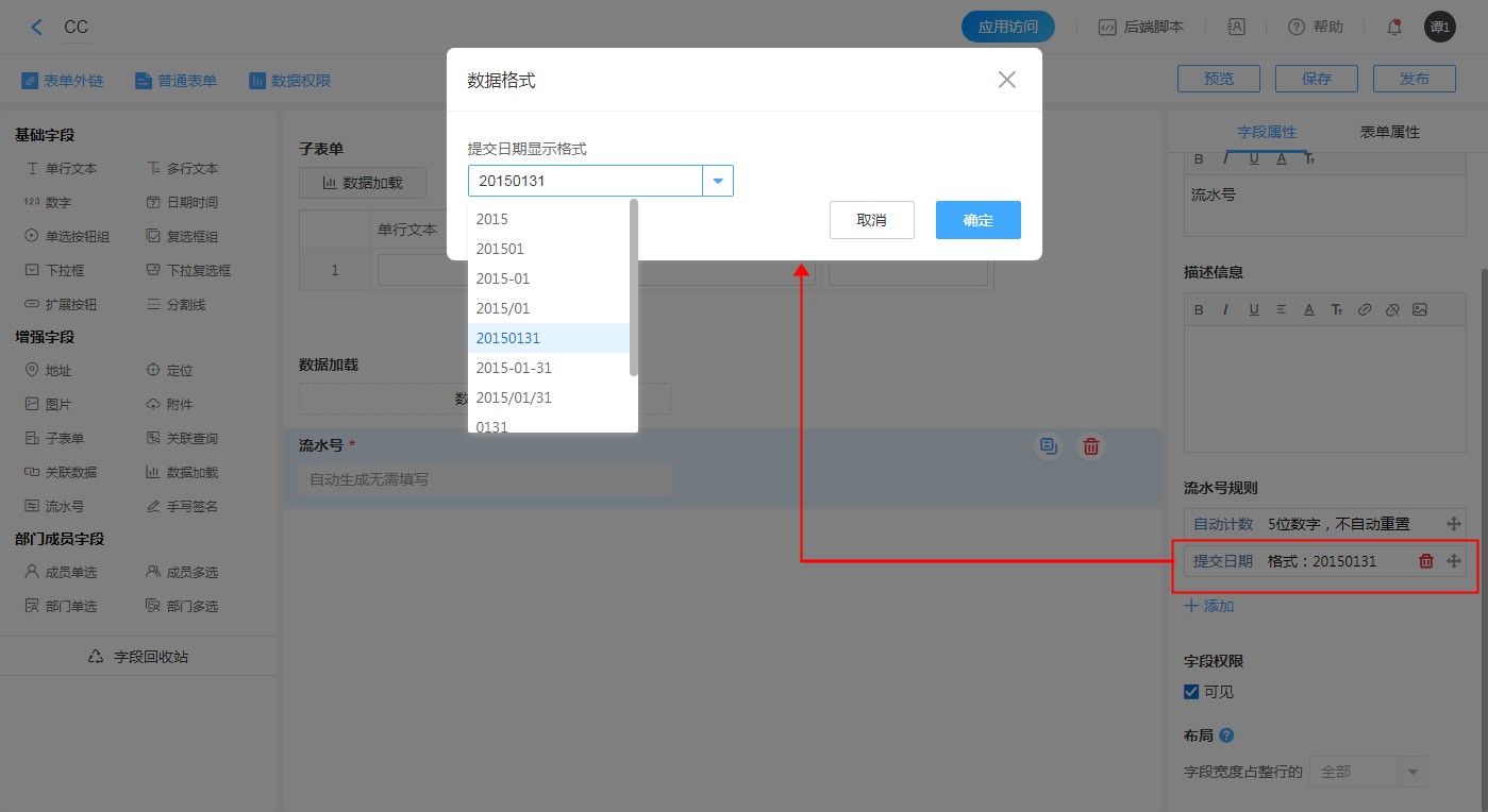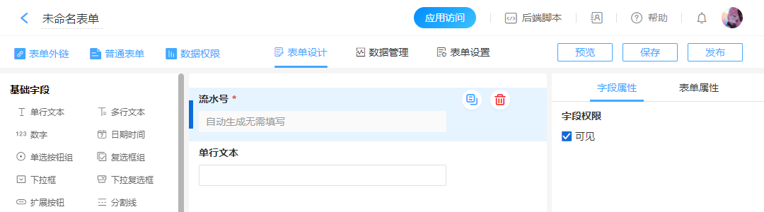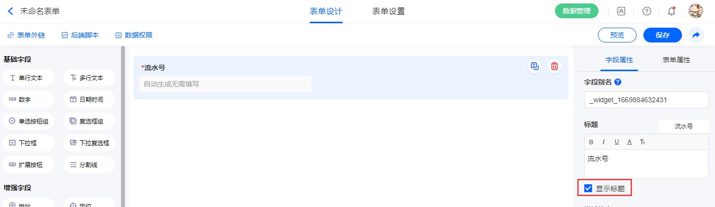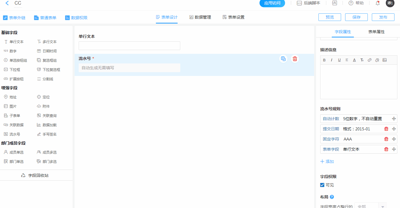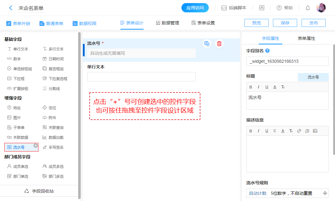 表单设计中经常涉及编号制作的问题,该控件为“流水号”字段,通过该字段即可轻松实现编号的自动生成。