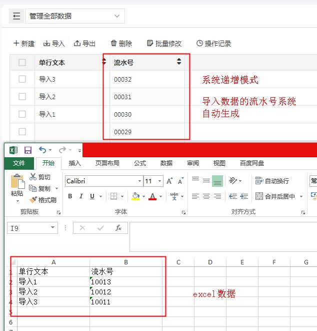 系统递增 由系统按流水号规则自动递增,不受excel导入影响。