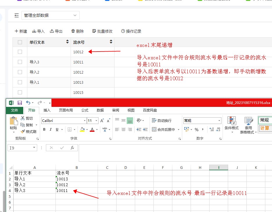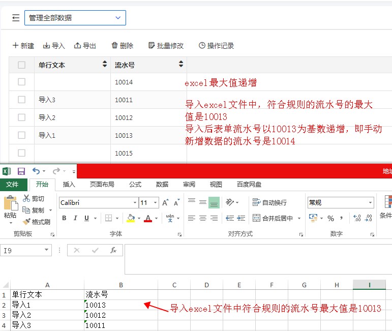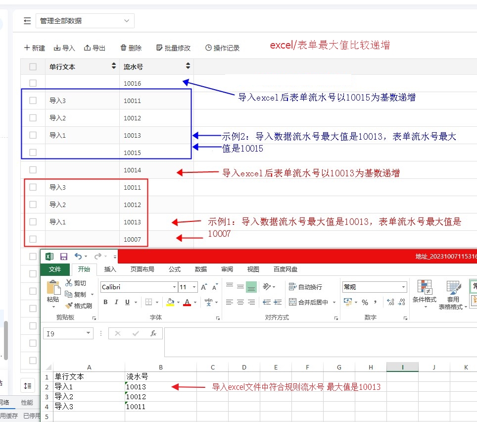 excel/表单最大值比较递增 excel导入后,符合流水号规则的最大索引和原始递增索引比较得到的最大值为基准递增。