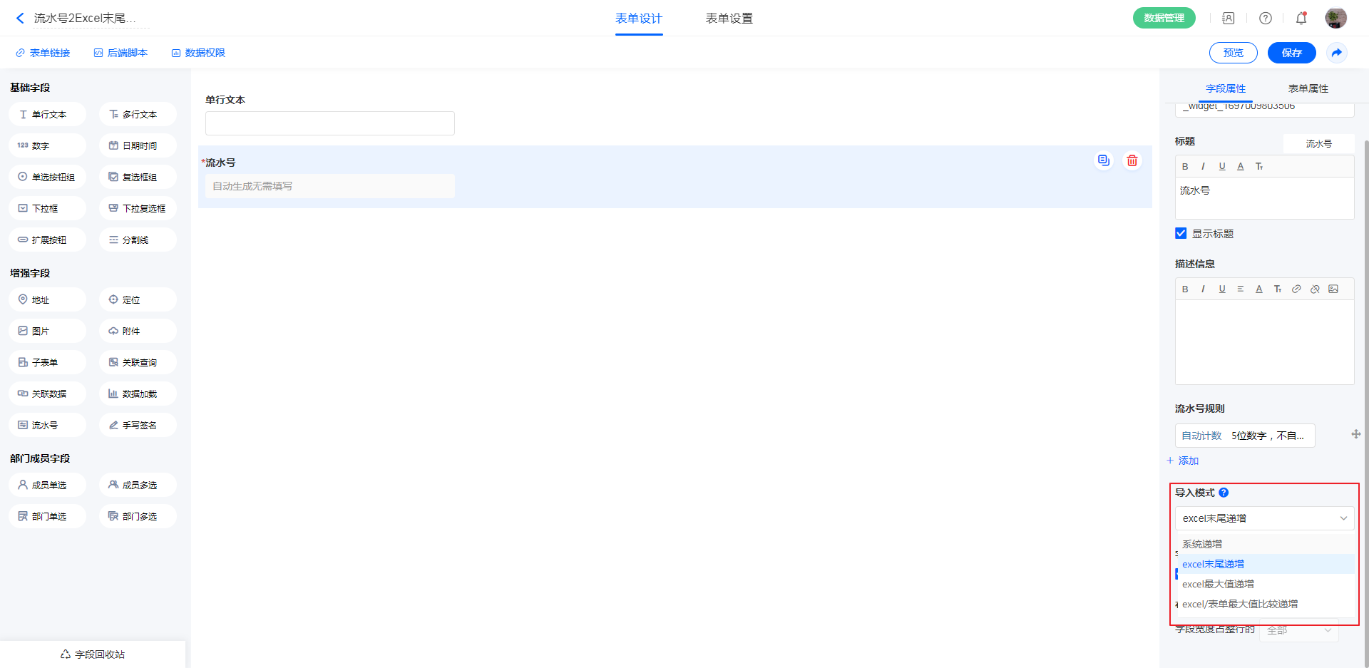 表单流水号支持导入,在表单数据管理导入数据,导入Excel文件的流水号,如果符合表单流水号规则,那么导入数据的流水号也计入流水号递增序列中。