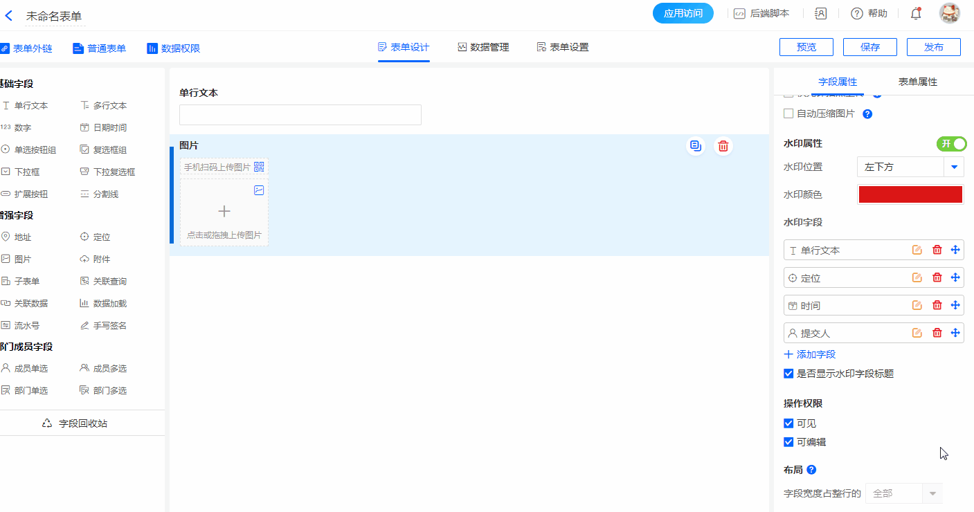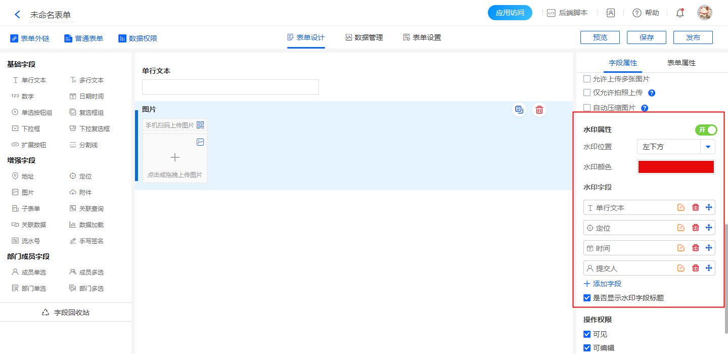 | 水印字段 | 支持设置本表单字段和定位、时间、提交人三个固定字段 注意:固定字段-定位需要地理位置授权 |