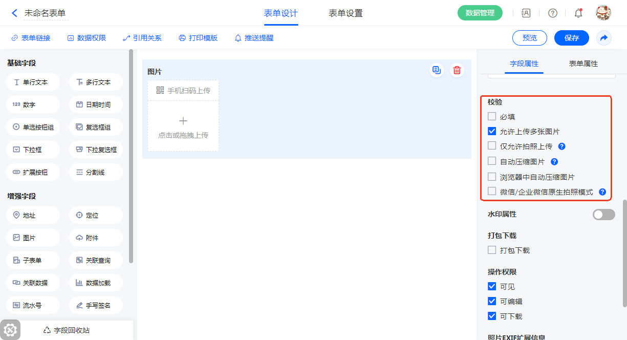 “图片”专门用于上传图片,同时带有压缩上传、仅允许拍照上传等功能。