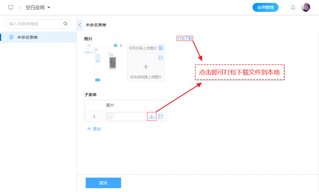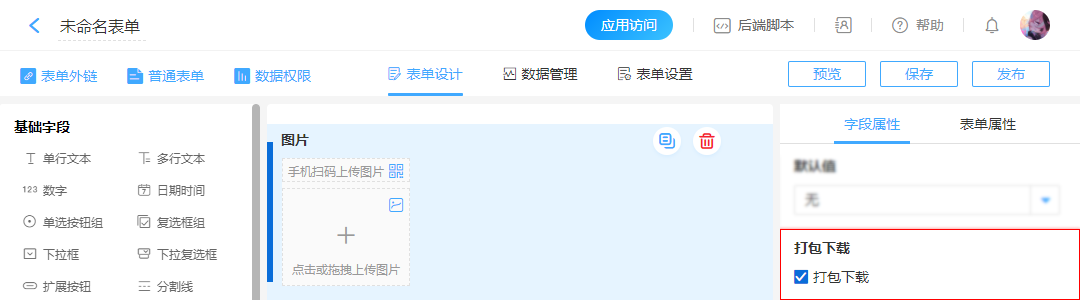 | 勾选[打包下载] | 填写表单时,上传图片后,会出现[打包下载]按钮,点击即可将图片打包下载到本地。 |