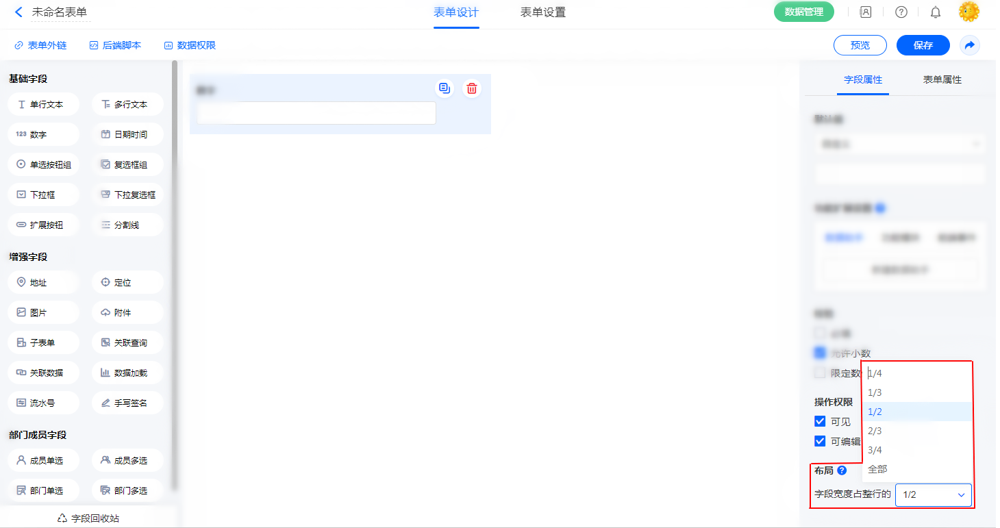 2、设置“字段属性”--布局,支持的字段宽度有:1/4、1/3、1/2、2/3、3/4 和整行